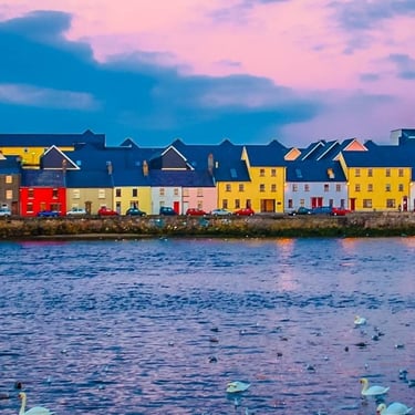 Lasciata la città alle nostre spalle, ci dirigeremo verso la costa occidentale attraversando paesaggi sempre più verdi e aperti: campi punteggiati di pecore, muretti in pietra e dolci colline accompagneranno il viaggio verso l’Atlantico. Faremo una breve sosta a Galway, città giovane e creativa affacciata sulla baia, famosa per la sua anima bohemien e la musica che anima le sue strade.