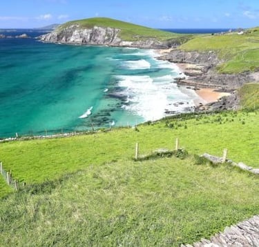Nel corso della giornata percorriamo la celebre Slea Head Drive, una delle strade costiere più belle al mondo. (*un affascinante percorso ad anello di circa 50 km, strada stretta e da percorrere con estrema prudenza). Qui il paesaggio diventa quasi irreale: scogliere a picco sull’oceano, spiagge selvagge come Coumeenoole Beach, o Inch Strand verdi colline battute dal vento e isole che affiorano all’orizzonte. Ogni curva regala un punto panoramico diverso e invita a fermarsi per scattare fotografie o semplicemente per ascoltare il rumore del mare.