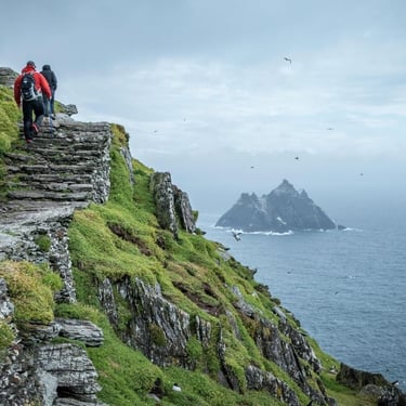La traversata nell’Atlantico è già di per sé un’esperienza emozionante: onde, vento e l’orizzonte aperto accompagnano l’avvicinamento a queste isole scoscese che emergono dal mare come cattedrali di pietra. Skellig Michael appare all’improvviso, verticale e imponente, avvolta da un silenzio quasi irreale. Una volta sbarcati, si sale lungo gli antichi gradini in pietra scavati dai monaci oltre mille anni fa, fino a raggiungere il monastero medievale arroccato sulla cima. Le celle a forma di alveare, le croci e la vista infinita sull’oceano raccontano una vita fatta di isolamento, fede e resistenza agli elementi.